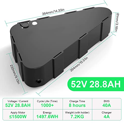 [Shock & Water Resistance]The ebike battery 52V is made of Prime quality strong ABS shell, shock-resistant , and meets with water-resistant IP65 level, Means you’ll be able to ride in a small rain for a moment, but not too long, to make sure the battery life.