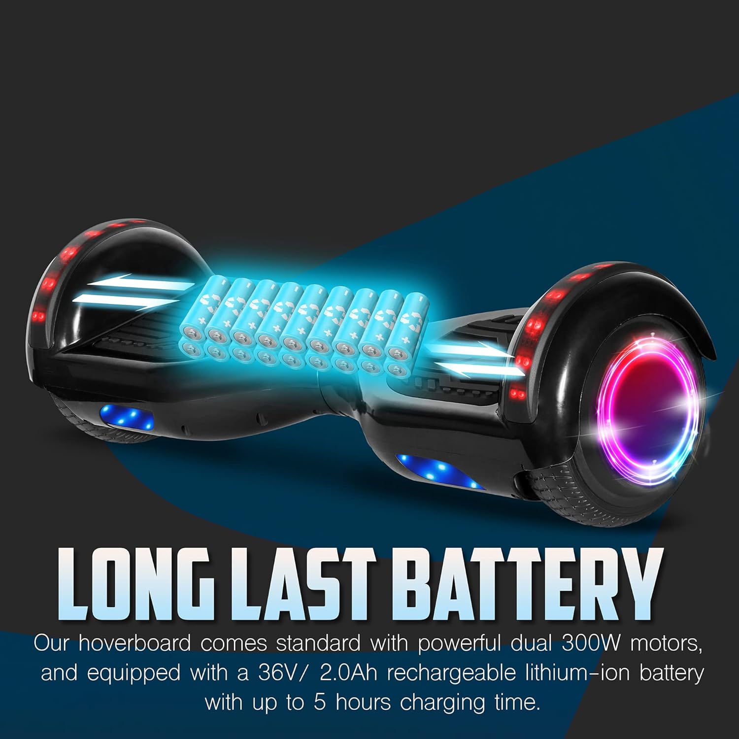 6. 5″ wheels with high quality rubber tires and comfortable foot pedals, provide smooth riding experience. Smart Self balancing system makes it easier than ever for beginners to learn to ride a hoverboard.