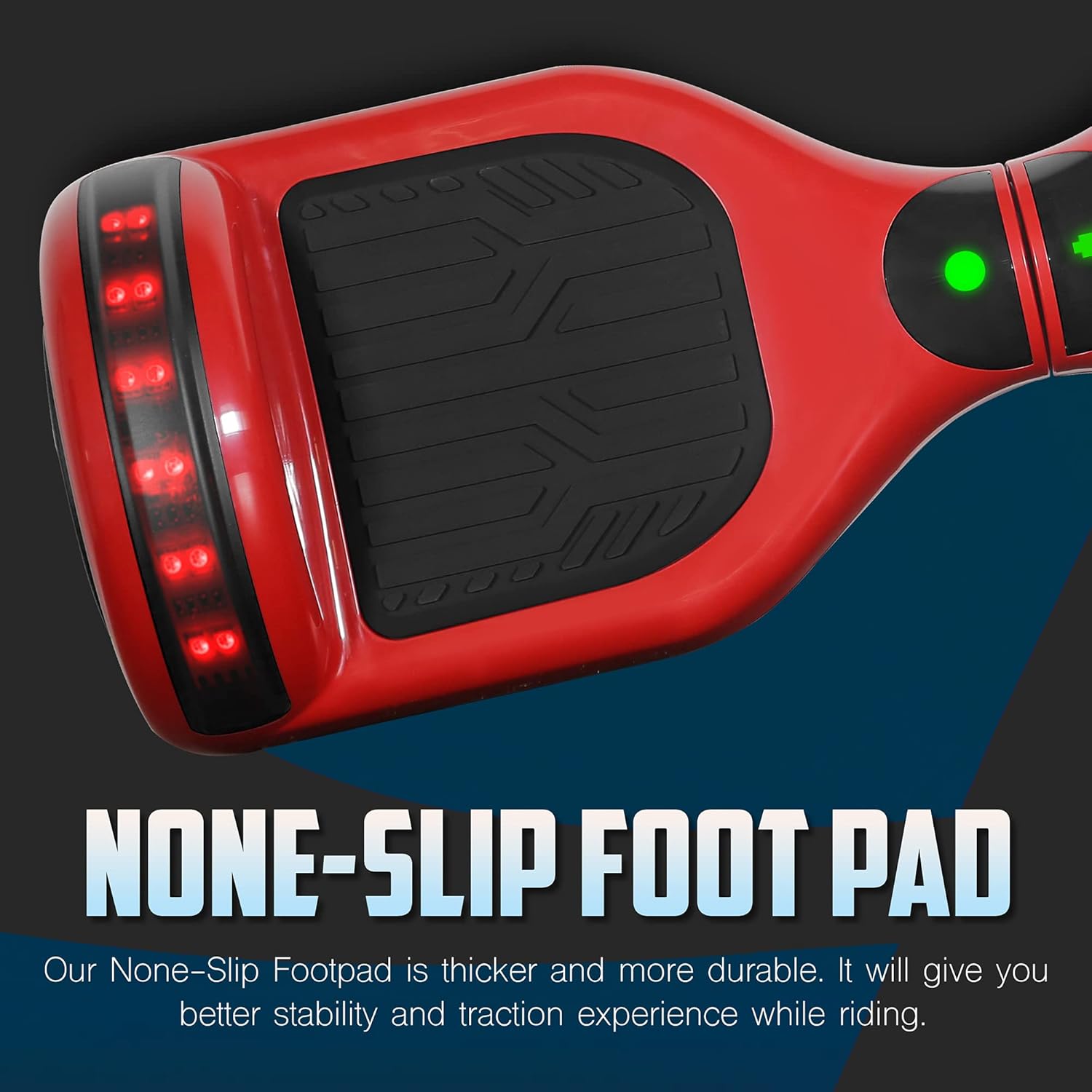 The electric hoverboard has a thick and durable non-slip footpad, it gives you better control and stability. The 6.5” never flat rubber tires gives a better traction for a comfortable ride.