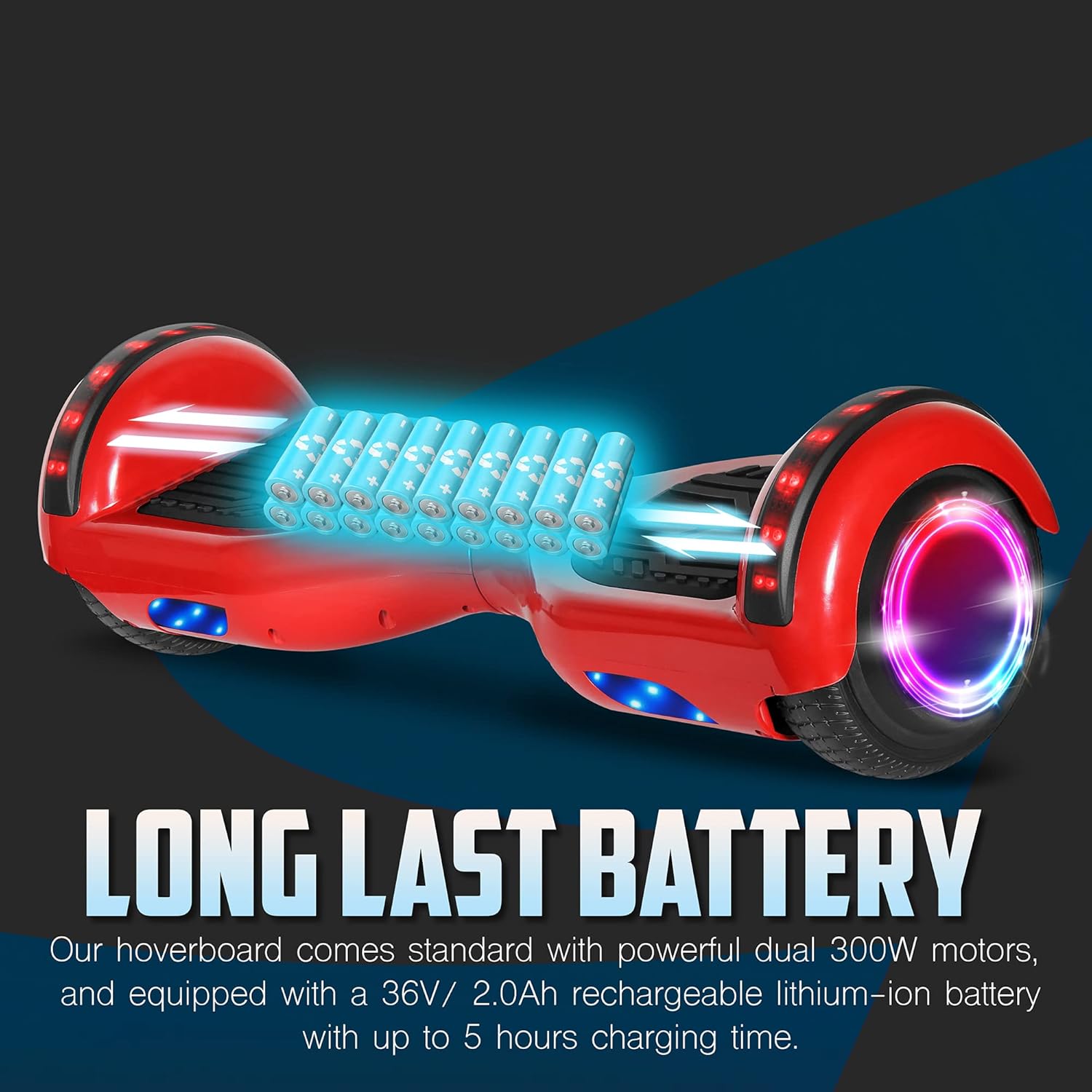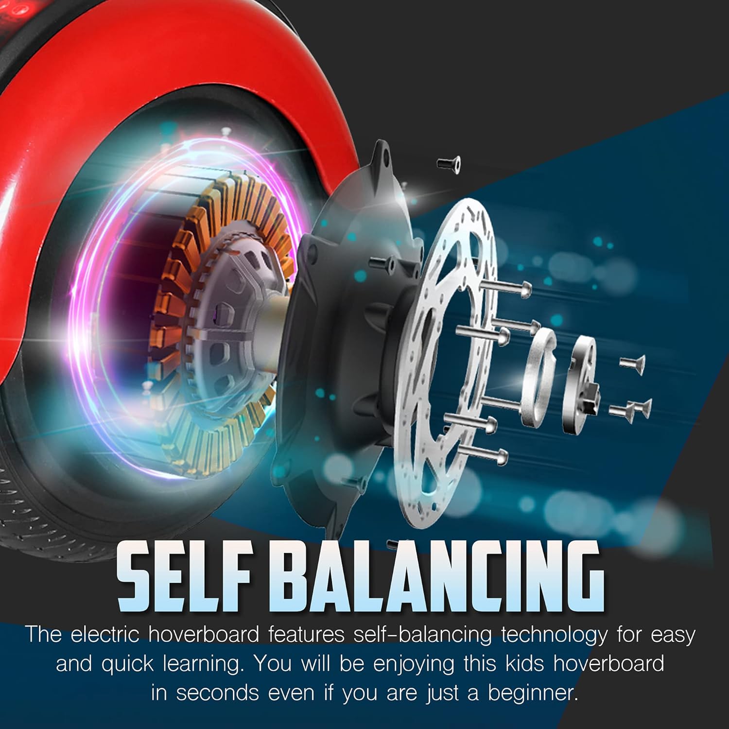 6. 5″ wheels with high quality rubber tires and comfortable foot pedals, provide smooth riding experience. Smart Self balancing system makes it easier than ever for beginners to learn to ride a hoverboard.