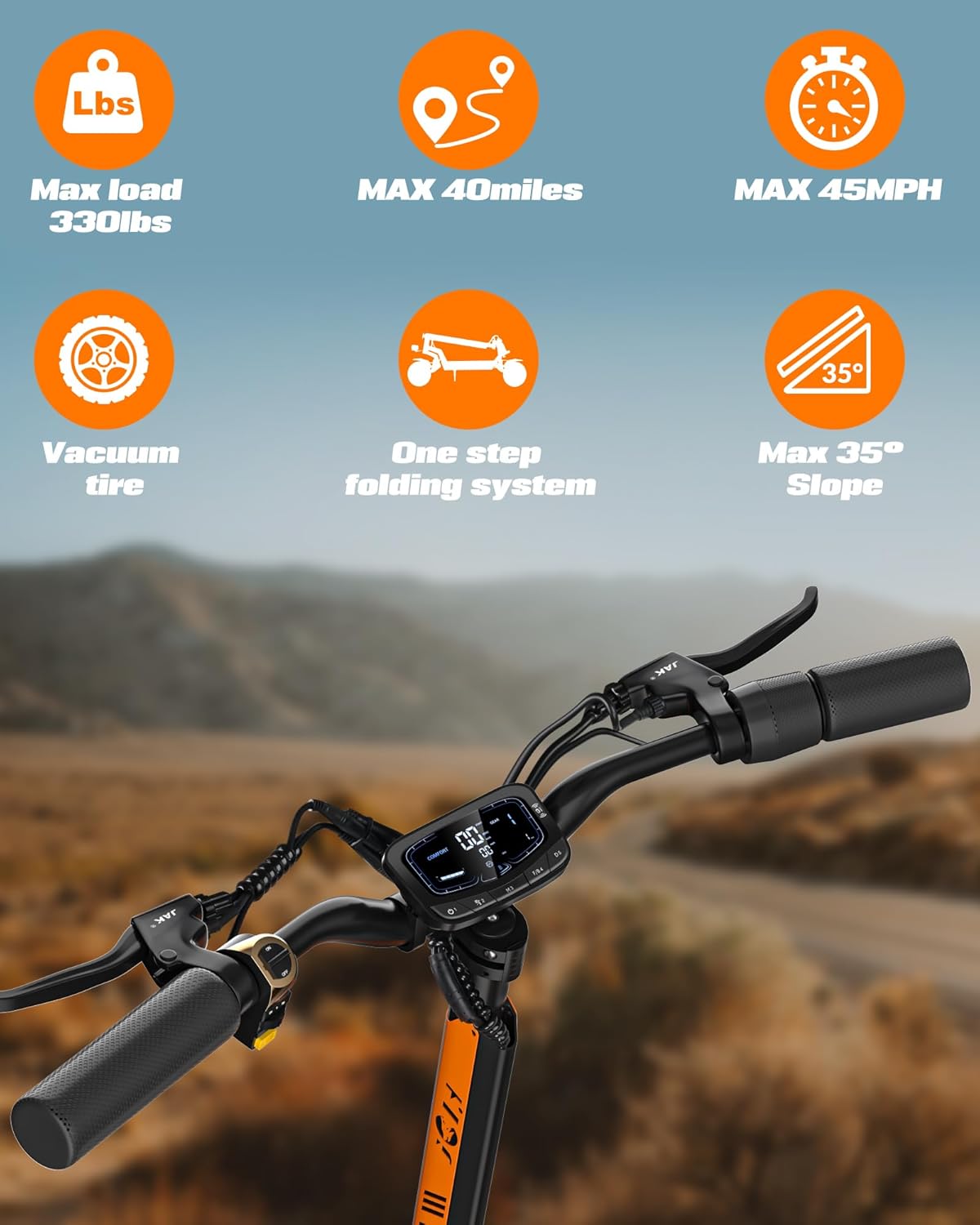 【Efficient & Long-Range】The JGH X5 Ultra electric scooter boasts a powerful 3200W dual motor and a 52V 20.8A large-capacity battery. Under specific riding conditions, it can reach a top speed of 45 mph and travel a distance up to 40 miles on one charge, allowing for efficient and long-range rides.