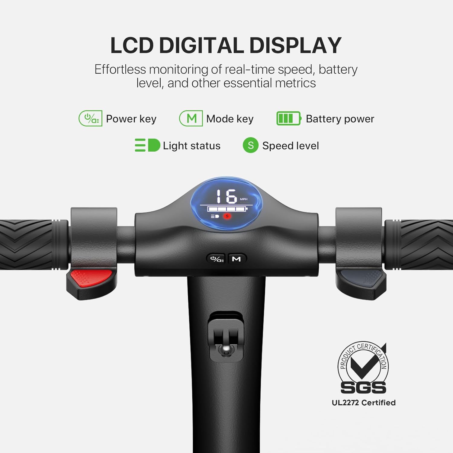 SAFE AND SECURE: The S10 electric scooter is equipped with a dual brake system, consisting of a motor electronic brake on the handlebar and a foot friction rear brake on the back wheel. It also has CE/UL/FCC/RoHS safety certification, making it reliable and safe.The none-0 start mode needs to slide before starting to avoid falling due to inertia when starting suddenly.