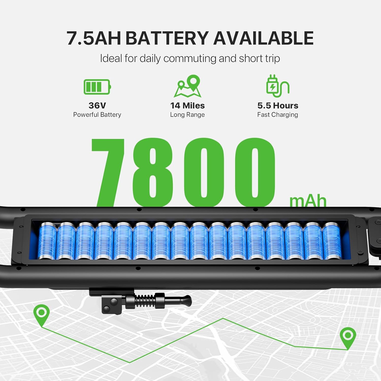 LONG-LASTING BATTERY: The scooter boasts a 270Wh(7.8AH/36V) lithium-ion battery capacity that provides an impressive mileage of 12-17 miles on a single charge. The battery can be fully charged in just about 5.5 hours and can climb max 15% incline, making it perfect for everyday commutes,university campus transport and so on.
