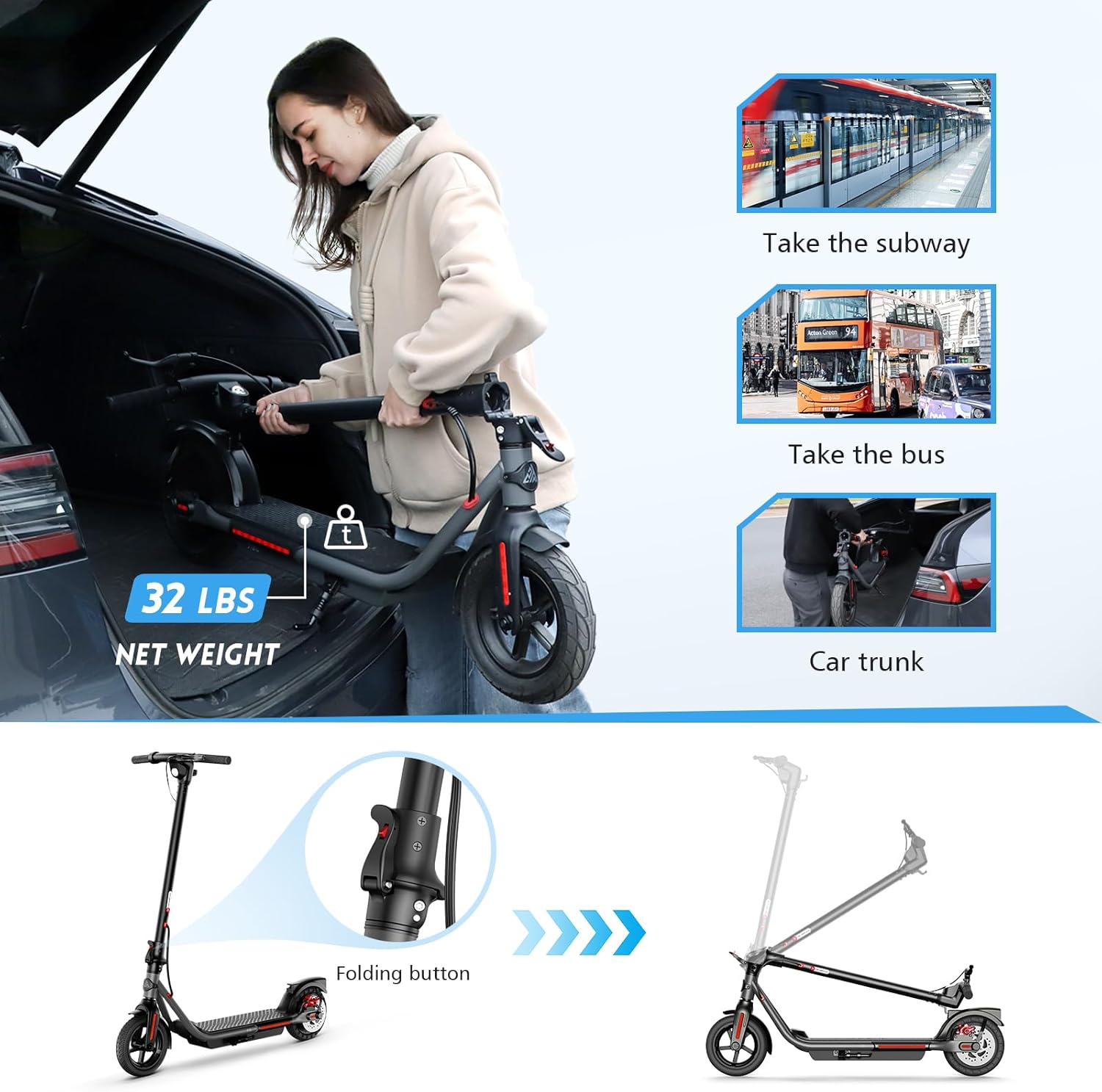 🌞【Folding Design】The electric scooter for adults weighs only 33LBS and can be folded with one click. It can be lifted with one hand and can be placed in the trunk of a car, in school and under a desk. It can also be taken on public transportation, making it very convenient to carry and store.