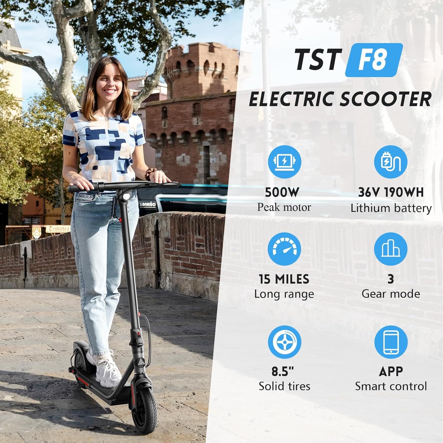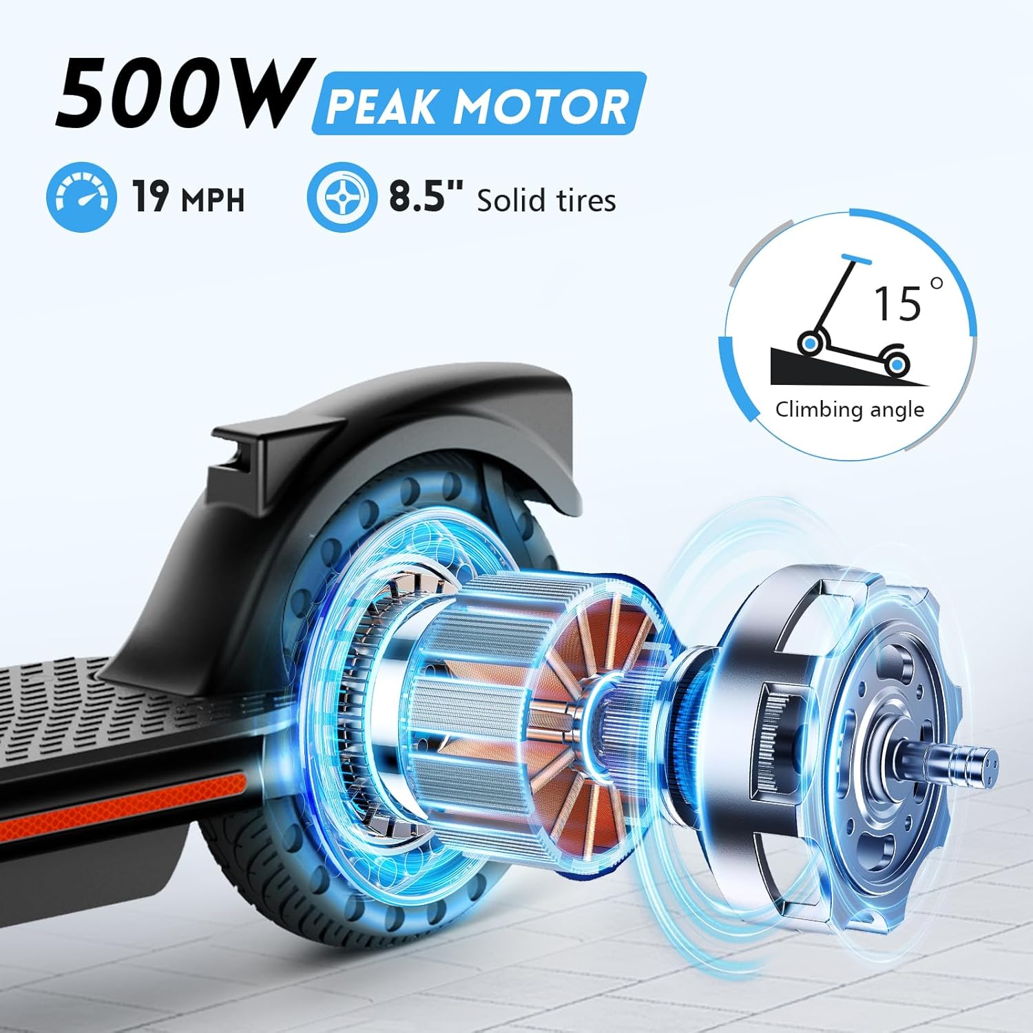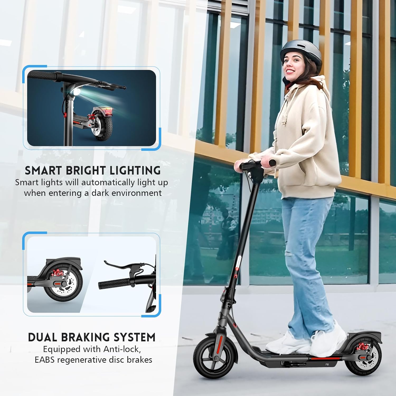 ✅【Intelligent Safety System】The escooter adults has an advanced dual braking system, which brakes smoothly and effectively ensures riding safety. It is also equipped with a smart headlight that will automatically light up when entering a dark place, improving the safety of night riding. The 8.5” solid tires provide a good ride and are very smooth.